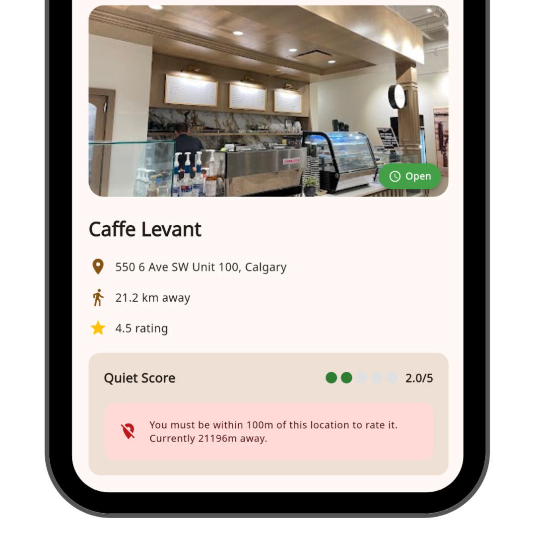 Quiet scores are crowd-sourced and time-aware. A spot may be quiet in the morning and busy in the afternoon, Nooq Spot helps you decide before going.